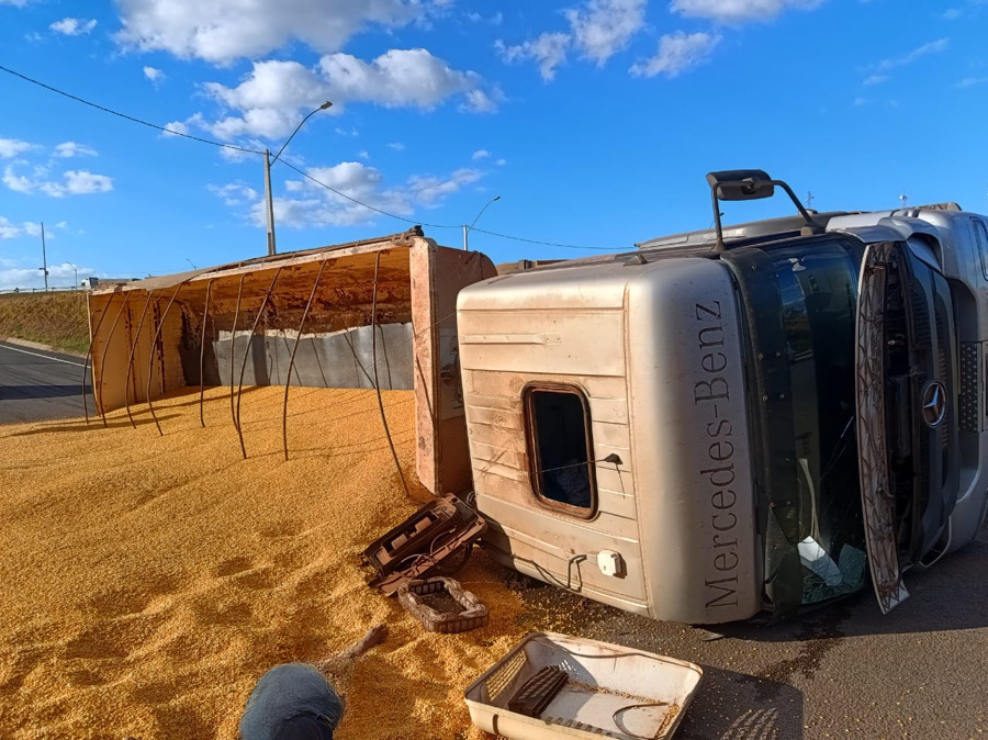 Segundo informações a carreta estava carregada de milho, e uma pessoa ficou ferida