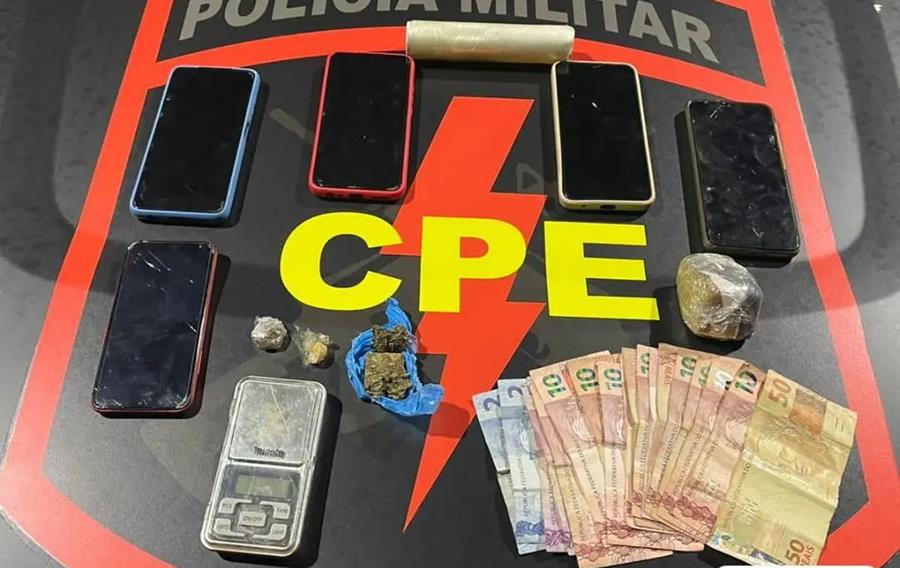 Com o abordado foi encontrado várias porções de drogas e durante as diligências foram identificados outros envolvidos no crime e apreendidos os seguintes objetos:
