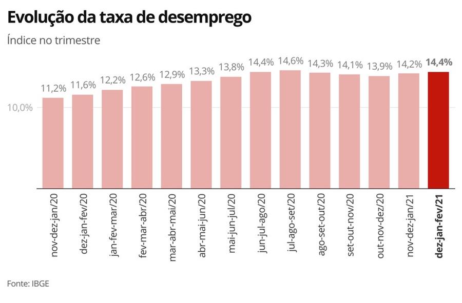 O desemprego no Brasil atingiu 14,4% no trimestre encerrado em fevereiro, segundo divulgou nesta sexta-feira (30) o Instituto Brasileiro de Geografia e Estatística (IBGE). Já o número de desempregados foi estimado em 14,4 milhões – recorde da série histórica iniciada em 2012.