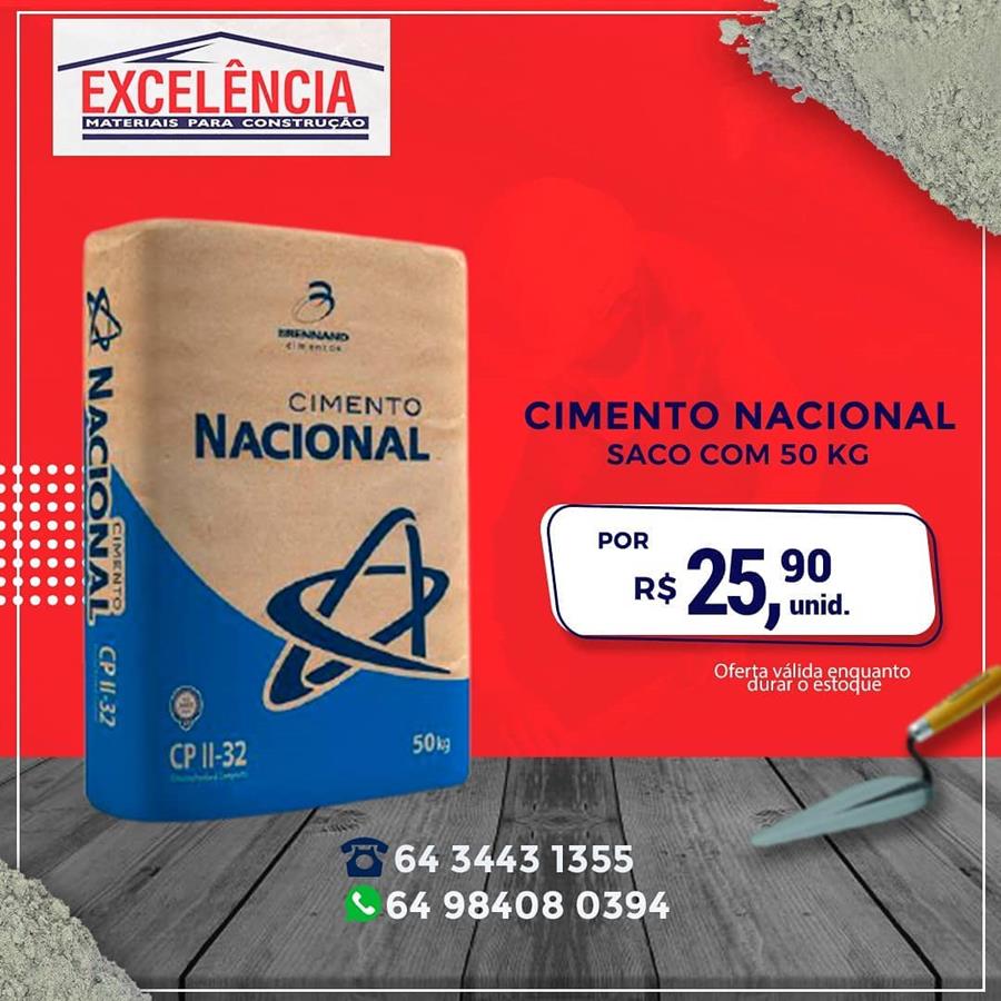 Quem gosta de economizar cimento nacional saco de 50 kg por apenas R$25,90, corra e faça suas compras, a Excelência fica na Av Goiás n 56, Jardim Brasiliense.