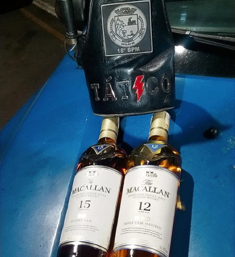 Após busca pessoal e consulta de antecedentes, foi constatado ser o suspeito do cometimento do crime, ao ser questionado, informou que havia deixado as garrafas em uma casa abandonada. O mesmo apontou a equipe o local, onde foi localizado 02 (duas) Garrafas do Whisky da marca MACALLAN intactas. Diante disso, a equipe deslocou até a Central de Flagrantes para os devidos procedimentos.