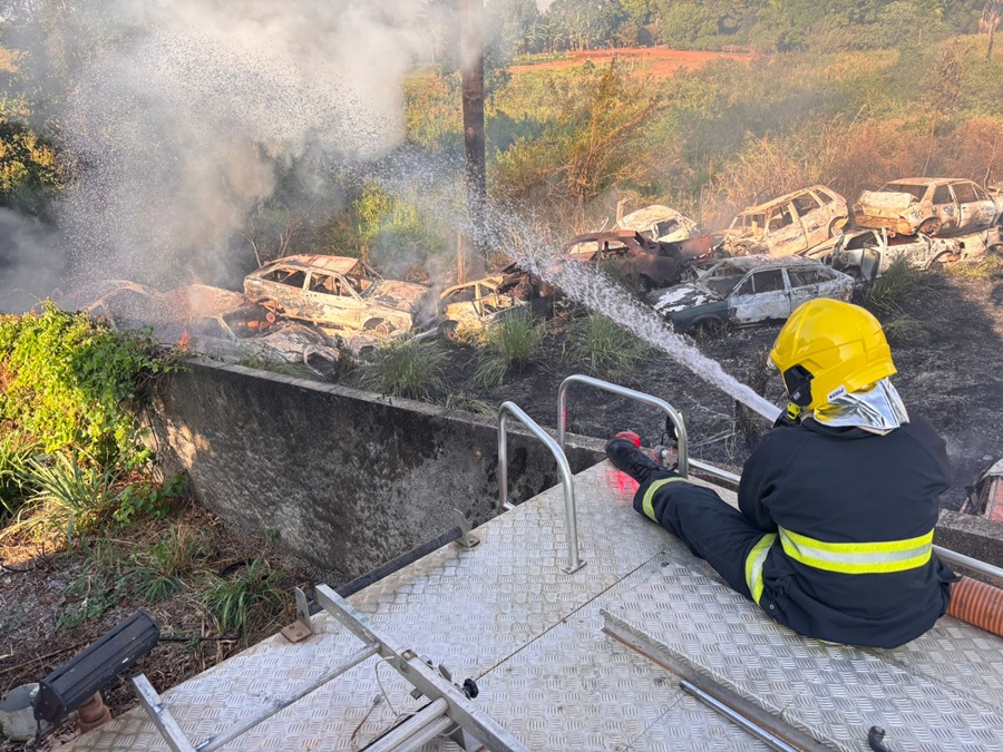 No pátio, havia aproximadamente 100 veículos de diversos tipos, incluindo automóveis de passeio, utilitários, veículos de transporte de passageiros e um caminhão. Devido à natureza do material combustível, observou-se grande quantidade de fumaça durante a operação.
