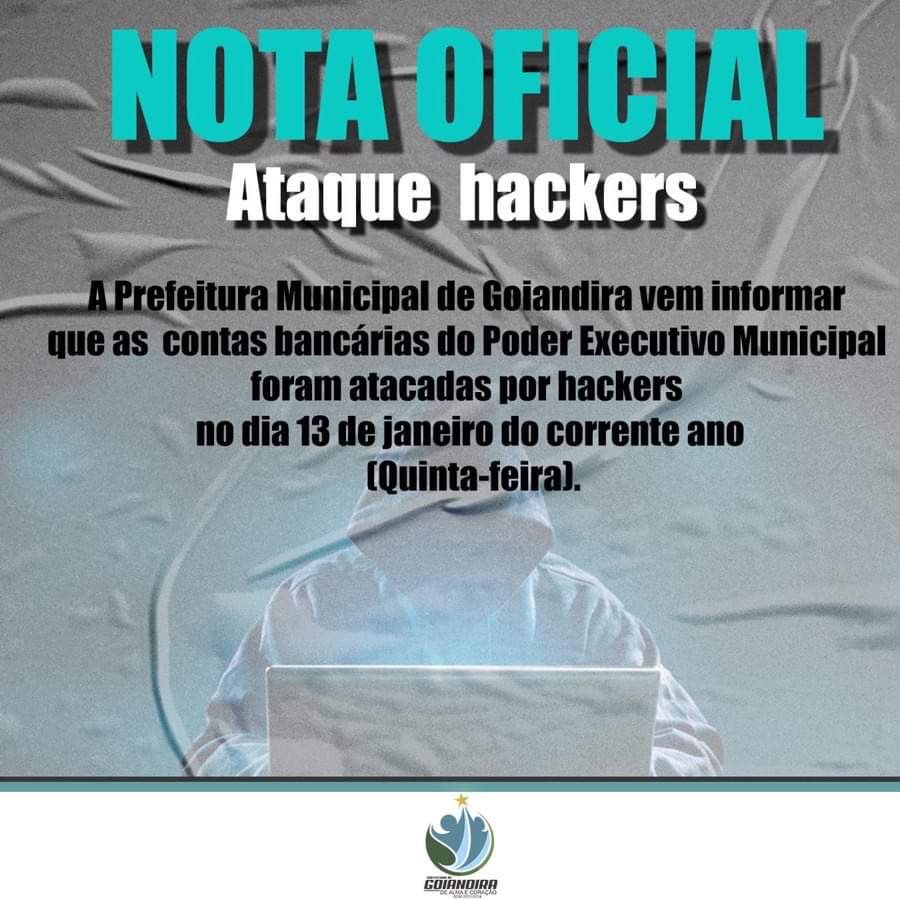 A Prefeitura Municipal de Goiandira, através do Prefeito Municipal Sr. Allisson Henrique Barbosa Peixoto, vem a público informar que as contas bancárias do Poder Executivo Municipal foram atacadas por hackers no dia 13 de janeiro do corrente ano (quinta-feira).