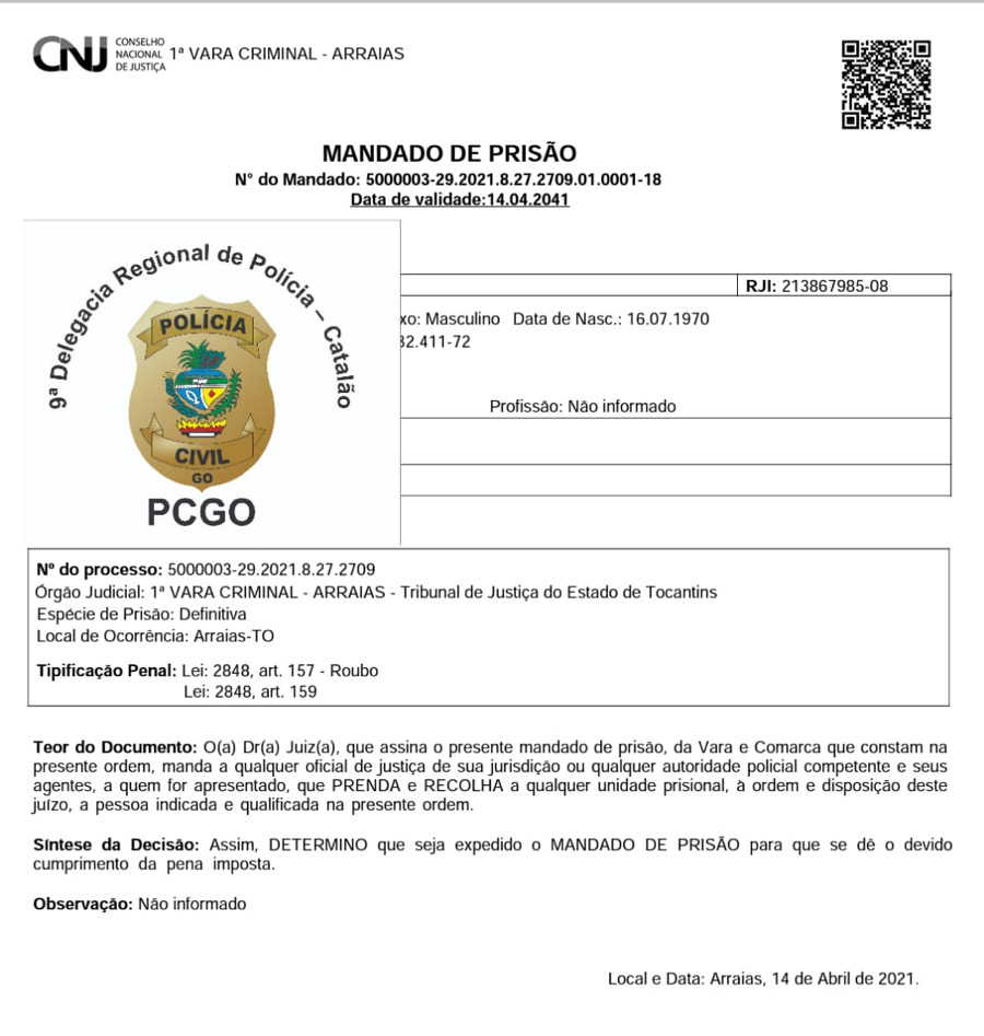 Segundo consta, o preso foi condenado por sentença criminal em processo que tramitou na Comarca de Arraias-TO, pela prática dos crimes de roubo qualificado e sequestro (arts.157, pár. 2°, e 159, do CP), tendo a PCGO recebido informação e, após diligências, localizou o condenado naquela cidade e realizou sua prisão, sem nenhuma reação.