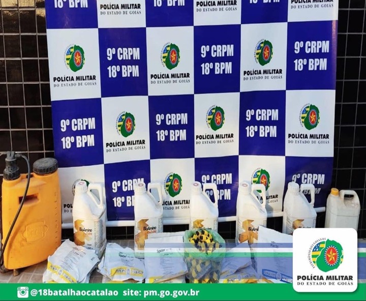Foram apreendidos defensivos agrícolas, bombas de pulverização, bicos de irrigação e redes de pesca, produtos avaliados em aproximadamente 25 mil reais, que foram localizados pelas equipes durante abordagem a um veículo suspeito.