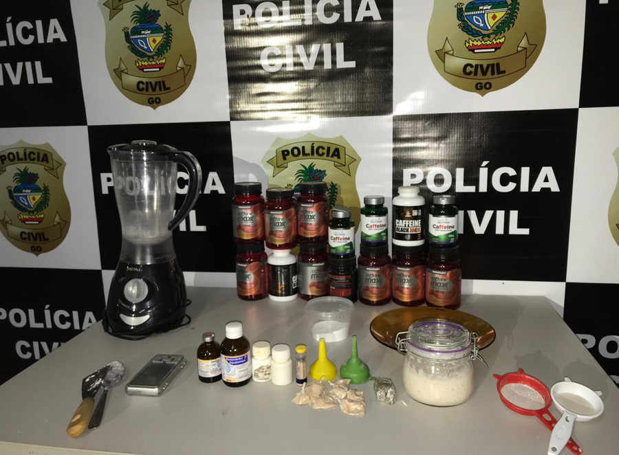 Durante a ação policial em sua residência foram apreendidos entorpecentes do tipo Cocaína, balança de precisão, diversos insumos químicos para preparação das drogas, bem como petrechos utilizados na transformação e preparação dos entorpecentes.