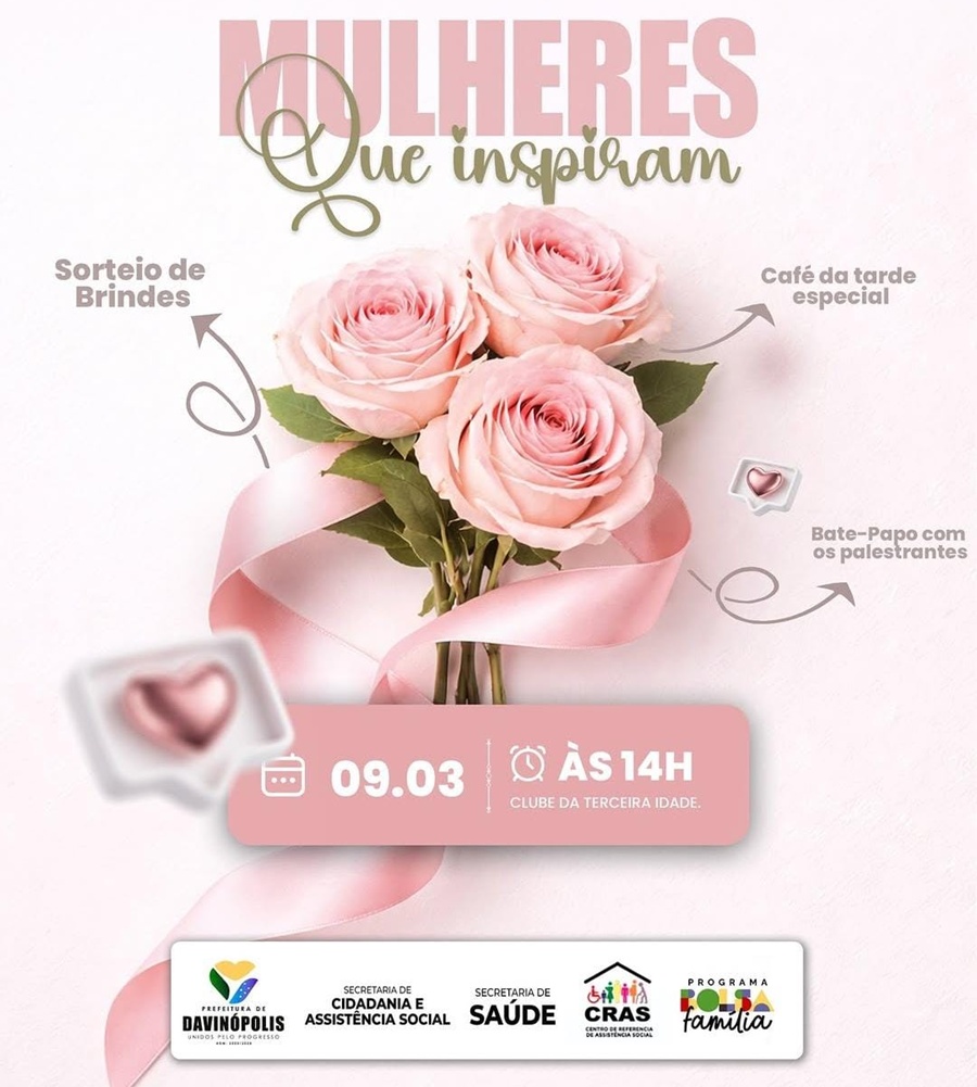 A Prefeitura de Davinópolis, por meio da Secretaria Municipal de Cidadania e Assistência Social, em parceria com a Secretaria Municipal de Saúde, o Centro de Referência de Assistência Social (CRAS) e o Programa Bolsa Família, realiza no próximo dia 09 de março, às 14h, no Clube da Terceira Idade, o evento “Mulheres que Inspiram”.