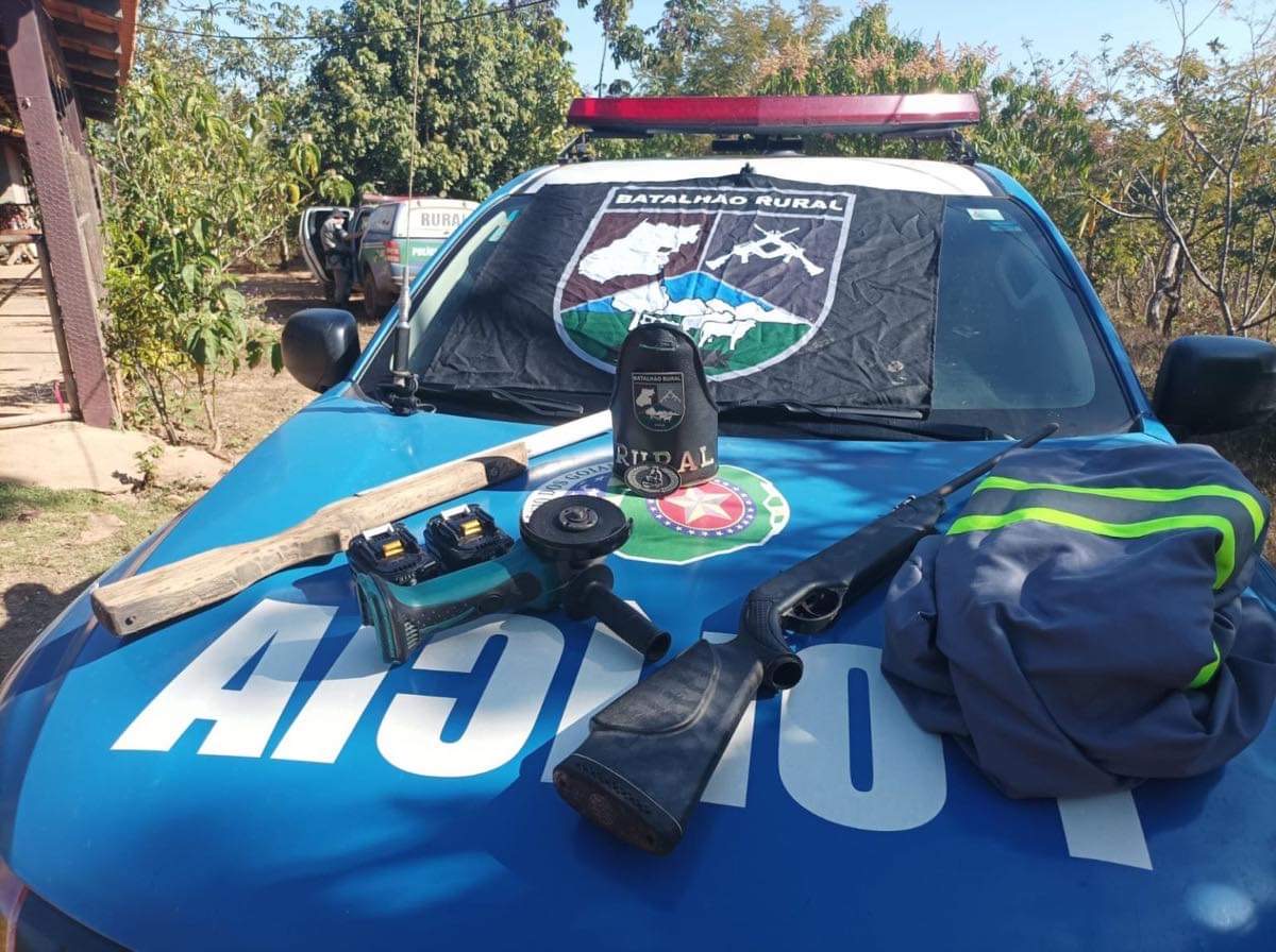 Com o suspeito, os policiais encontram duas armas de fogo e uma lixadeira, a qual, de acordo com os policiais, era utilizadas para retirar as baterias dos postes.