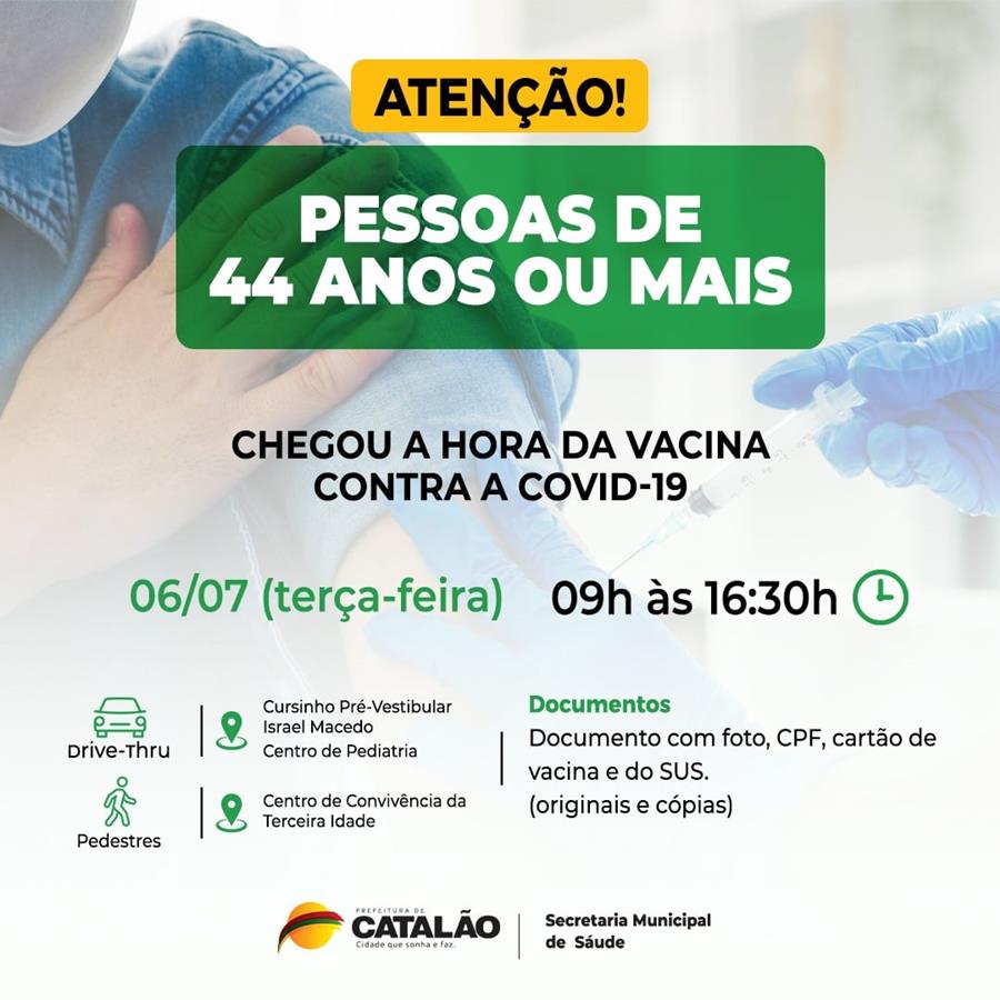A imunização contra o coronavírus avança novamente em Catalão. Nesta terça-feira (06), a aplicação da dose será liberada para nova faixa etária: aqueles que tenham 44 anos poderão receber o imunizante da Janssen, do grupo Johnson e Johnson.
