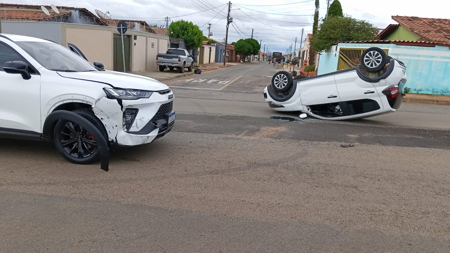 Com a força do impacto um dos veículos capotou e ficou com as rodas para cima no meio da rua.