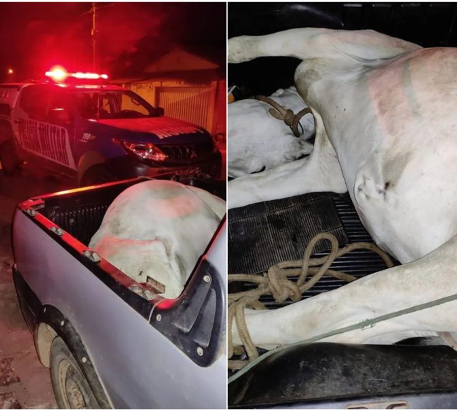 Após receber denúncia anônima sobre um veículo com um semovente abatido na carroceria de uma pick-up Strada de cor prata, juntamente com equipe de Davinópolis, a policia organizou um cerco e nas proximidades do Km-10 GO-210, as guarnições realizaram a abordagem ao referido veiculo que estava sendo conduzido pelo autor, após entrevista com o condutor do veículo ele disse que a novilha pertencia ao seu Pai o Senhor L. B.S,.